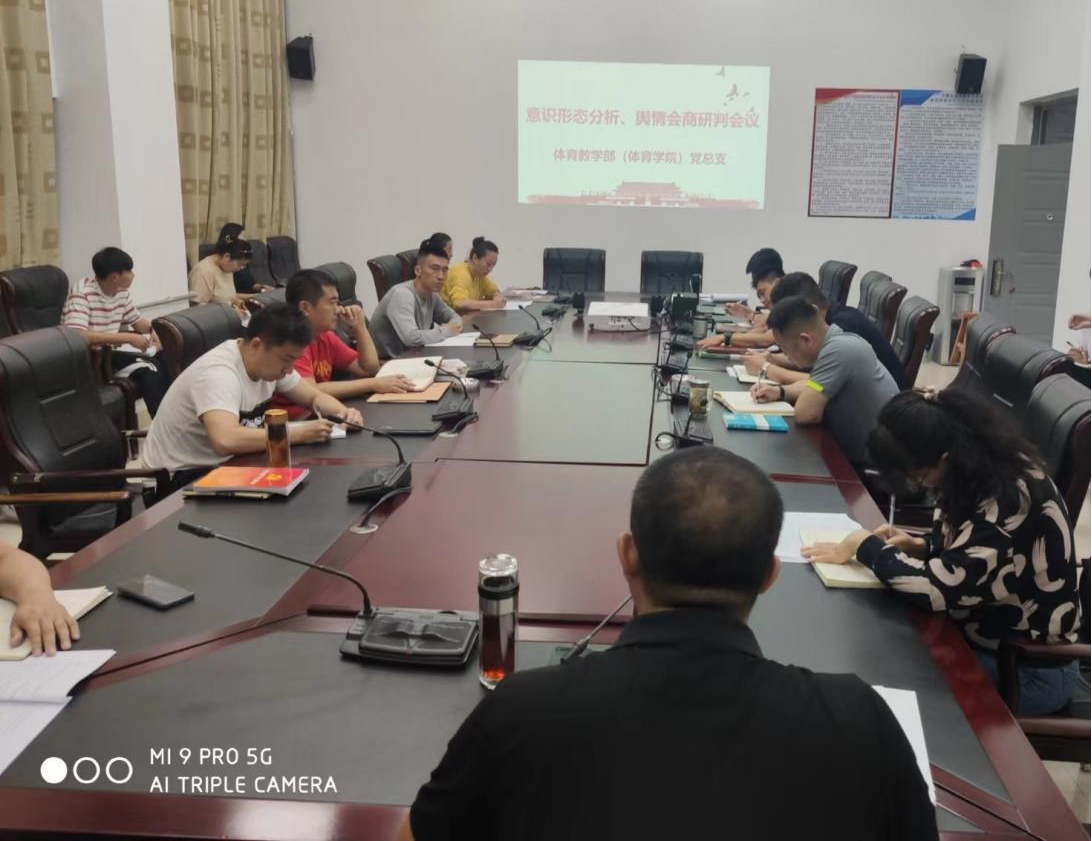 6月21日,太阳集团tyc539党总支在体育馆二楼会议室召开意识形态分析、舆情会商研判会议,贯彻落实学校关于意识形态工作要求,研究部署下一步工作。党总支书记苗凯主持会议,学院科级以上领导干部及任课教师代表参会。