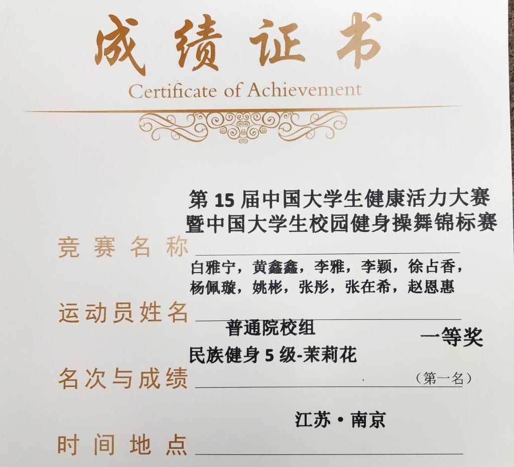 太阳成集团tyc53910名运动员组成的代表队参加了普通院校组民族健身规定动作项目的比赛。赛场上,每位运动员凝心聚力、全力以赴,将最好的状态和最高的水平展现了出来。在体育教学部(足球学院)李萍、张巨荣、闫智惠三位教练员指导下,最终荣获参赛项目第一名的优异成绩。在备赛的一个多月来,每位运动员都积极向上、坚持不懈、不畏困难,教练员们悉心教导,精益求精,为本次比赛的胜利奠定了基础。