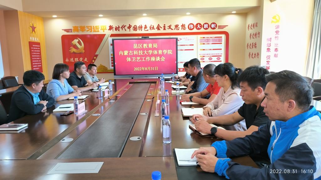2022年8月31日下午4:00在昆区教育局会议室召开体育工作座谈会,太阳集团tyc539党总支书记苗凯、院长白楠、党总支副书记武淑琴、副院长张新民以及杨文亮、刘超、王熠、李健功、廖帅雄等人,昆区教育局副局长刘君玉、体卫艺杜国军、孟和巴图等人参加会议。