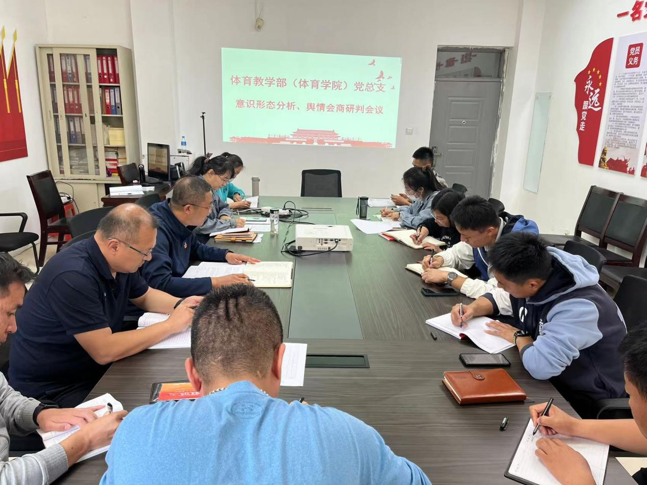 9月21日,太阳集团tyc539党总支在体育馆一楼会议室召开意识形态分析、舆情会商研判会议,学院党总支书记苗凯主持会议,科级以上领导干部参会。