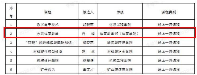2022年7月,根据学校《关于开展2022年一流本科课程遴选推荐工作的通知》要求,教务处组织开展了2022年一流本科课程认定推荐工作。经学院初审,项目负责人汇报,学校专家组评审,我院《公共体育教学》批准建设校级线上一流课程。
