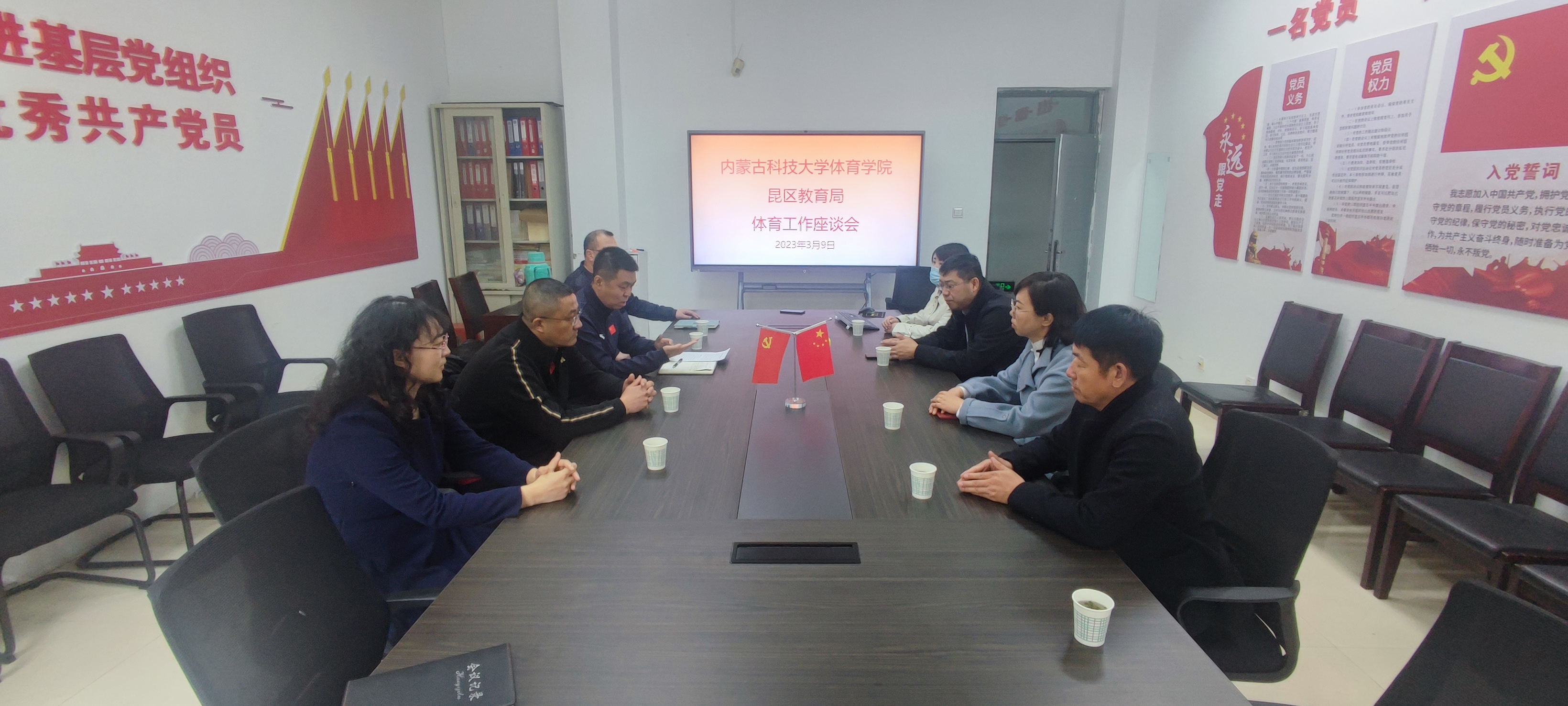2023年3月9日上午在太阳集团tyc539体育馆一楼会议室召开学校体育工作座谈会,太阳集团tyc539党委书记苗凯、院长白楠、党委副书记武淑琴、副院长张新民以及刘超、王熠,昆区教育局副局长刘君玉、体卫艺杜国军、孟和巴图等人参加会议。