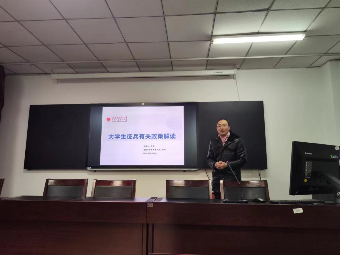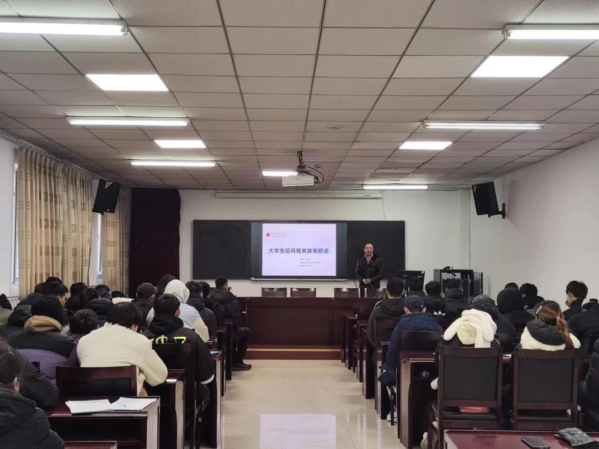 2023年12月21日,太阳集团tyc539邀请校党委学生工作部(学生处、人民武装部)齐明老师来我院就学生征兵入伍相关事宜进行专题宣讲,学院党委副书记武淑琴、学工办主任杨乐、团总支负责人王梦茹、体育教育专业全体同学参加。