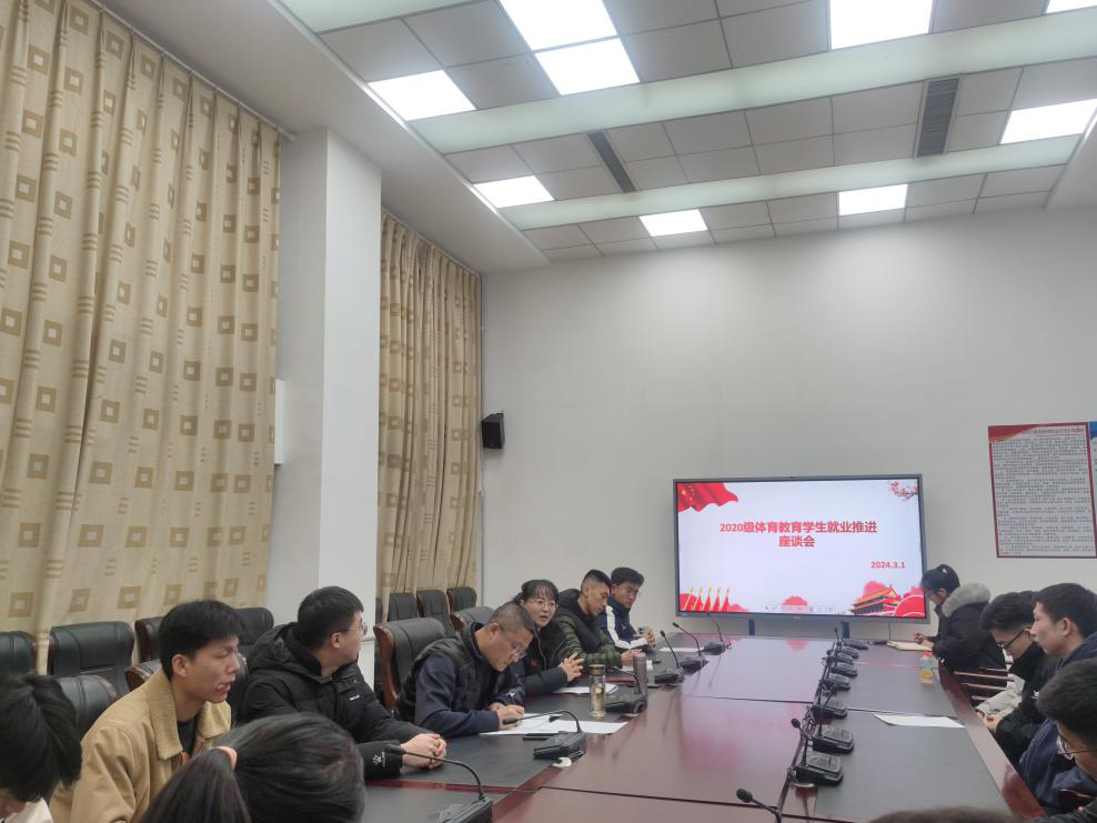 2024年3月1日上午,太阳集团tyc539召开2020级毕业生就业工作座谈会。太阳集团tyc539党委书记、2020级班主任苗凯、党委副书记武淑琴、学工办主任杨乐、团总支负责人王梦茹、2020级体育教育专业学生参加座谈。