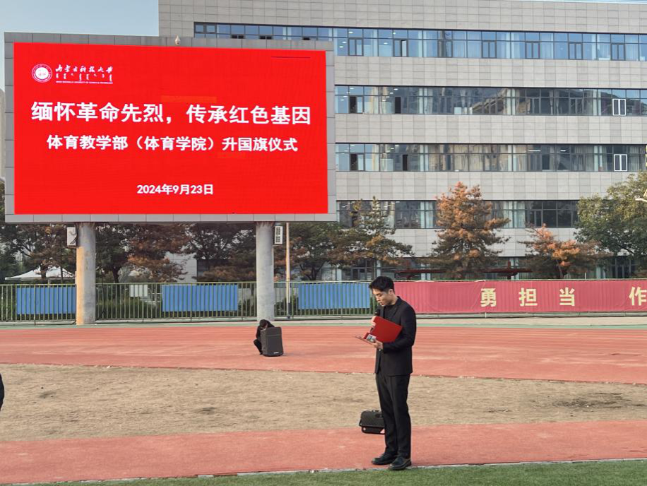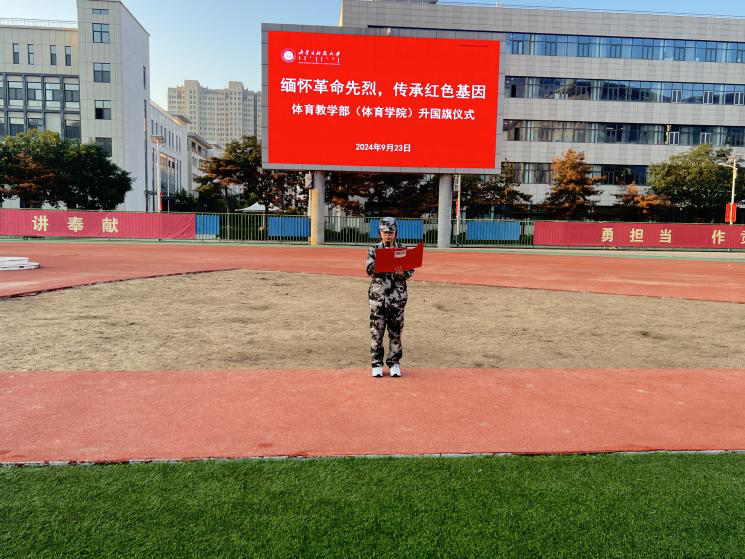 2024 年 9 月 23 日,太阳集团tyc539举行“缅怀革命先烈,传承红色基因”升国旗仪式,学院党委书记韩冰、院长白楠、党委副书记唐国桥、副院长张新民、副院长杜晓炜、师生党员、体育教育专业全体学生参加升旗仪式。升旗仪式由体育教育2023-1班张翊主持。