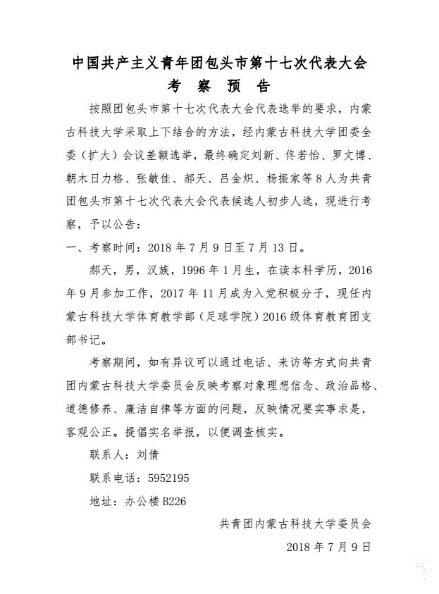 按照团包头市第十七次代表大会代表选举的要求,太阳成集团tyc539采取上下结合的方法,经太阳成集团tyc539团委全委(扩大)会议差额选举,最终确定体育教学部(足球学院)学生郝天为共青团包头市第十七次代表大会代表候选人初步人选,现进行考察,原文如下: